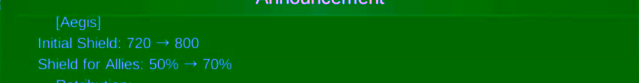 Aegis sendiri akan mendapatkan buff dari Moonton agar lebih berguna di Early game dari 720 menjadi 800 dan tak hanya itu, mereka juga menambahkan efek spell tersebut untuk pemain lain menjadi 70%. Pasalnya spell ini dapat menahan damage yang cukup tinggi pada saat mendapatkan ganked dari musuh dan berbeda dari spell revitalize, pengguna Aegis akan secara langsung mendapatkan efek shield tersebut, sehingga cukup berguna untuk melawan hero – hero burst damage seperti Eudora dan Aurora di Early game.