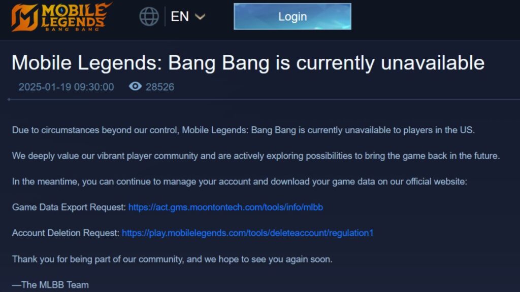 Pada 19 Januari 2025, para Gamer di Amerika Serikat menemukan game Mobile Legends: Bang Bang (MLBB) tidak dapat diakses di sana. Game ini sendiri dikembangkan oleh Moonton, anak perusahaan Nuverse yang dimiliki oleh ByteDance sebagai perusahaan di balik TikTok.
