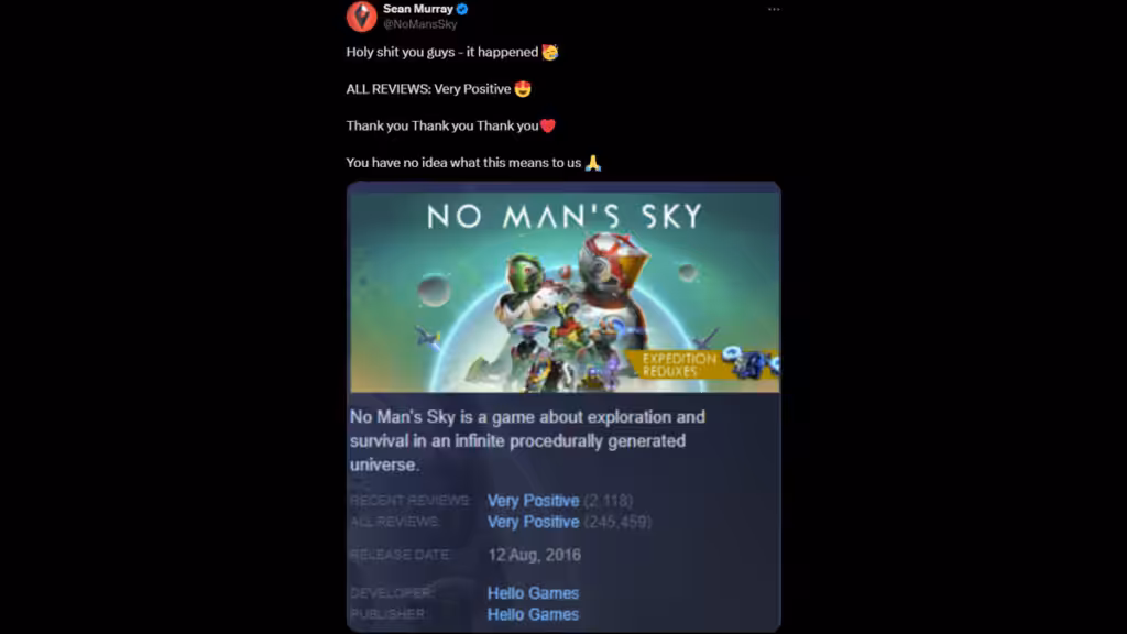 Sean Murray yang merupakan pimpinan dari studio Hello Games mengucapkan terima kasih melalui akun Twitter/X dirinya kepada para fans yang telah setia mendukung dan memainkan game mereka.