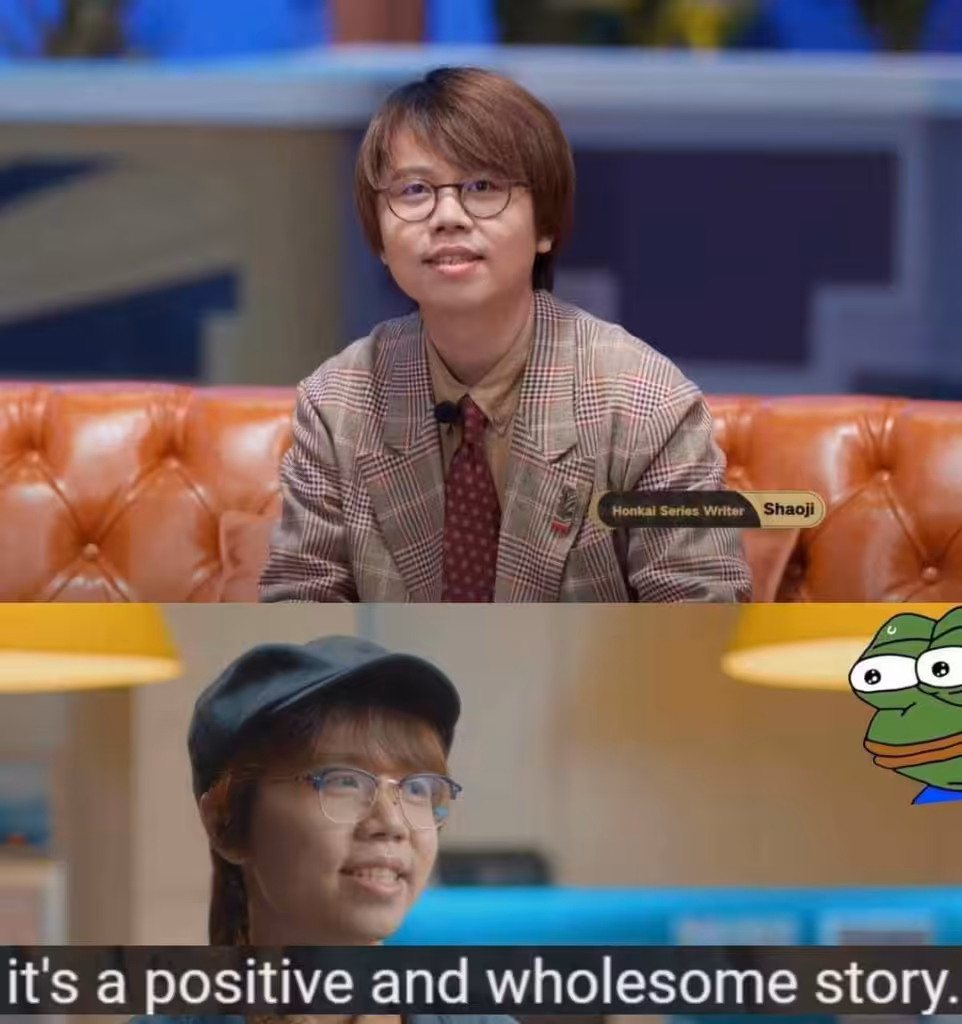 Seperti yang bisa kalian tebak, Shaoji adalah staf yang mengerjakan screenplay di cutscene “Final Lesson”. Kalian mungkin masih ingat dengan perkataannya yang legenda yaitu “It’s a positive and wholesome story” namun sambil membunuh salah satu karakter kesayangan fans di HI3.
