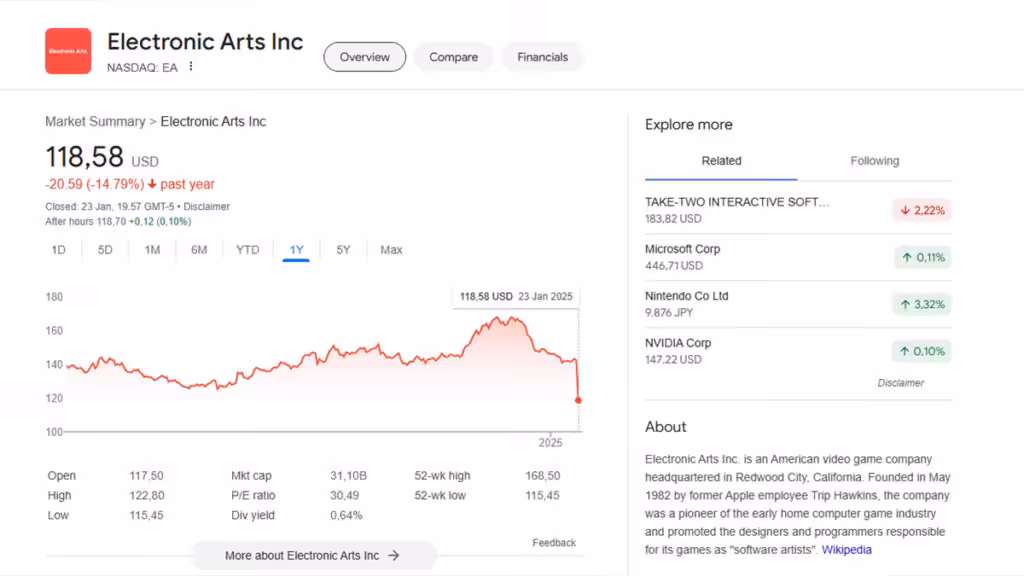 Dilansir dari laporan finansial Q3 tahun Fiskal 2025 EA, diketahui bahwa saham perusahaan tersebut telah turun sebesar 17%. Hal ini dikabarkan terjadi karena 2 game yang berada dibawah ekspektasi.