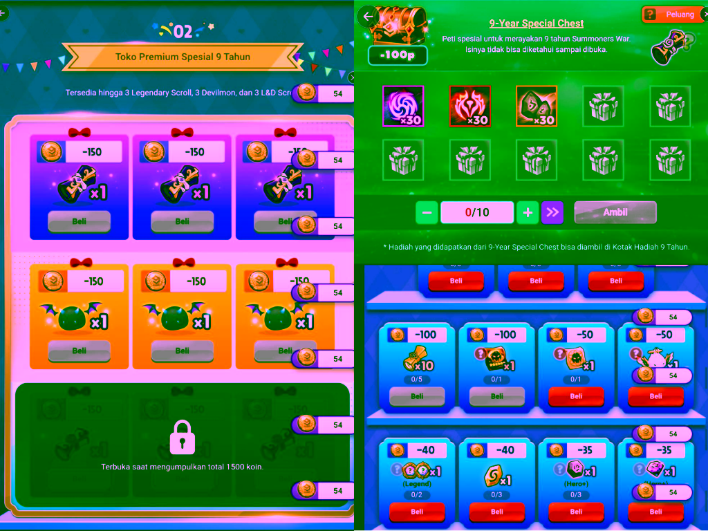 Di event ini, pemain bisa mendapatkan berbagai hadiah termasuk 9-Year Special Scroll, Legendary Scroll, Devilmon, dan L&D Scroll menggunakan koin yang mereka dapatkan. Tersedia juga toko-toko lainnya seperti Toko Rune yang menjual Rune Legendary dan Toko Bonus yang menjual Energy serta Mana Stone tanpa batas.