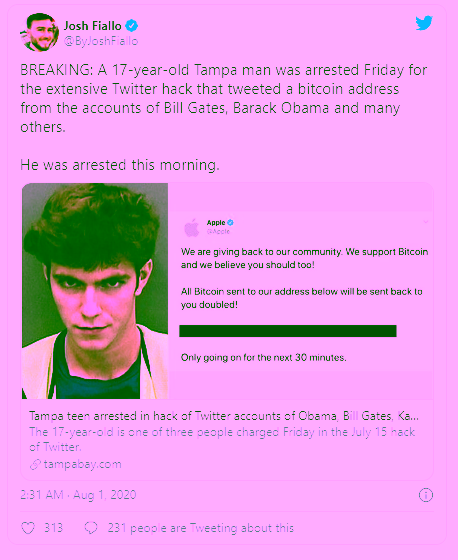 Dilansir dari Gamerant, peretas dan penipu Bitcoin akun twitter terkenal akhirnya tertangkap. Sebelumnya beberapa akun Twitter terkenal seperti Elon Musk, Bill gates, Barrack Obama, Uber, dll. Peretasan akun tersebut disertai dengan penipuan Bitcoin, dimana si peretas membuat tweet seolah pemilik akun untuk mengirimkan sejumlah uang melalui Bitcoin dan dijanjikan untuk di bayar 2 kali lipat.