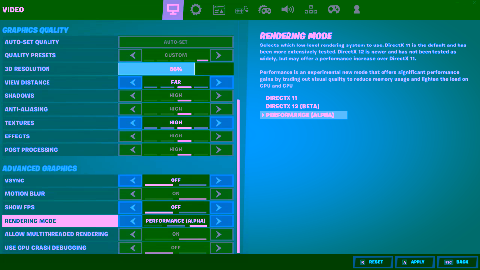 Epic Games tidak memberikan detil lebih lanjut tentang modenya, namun memberikan beberapa contoh fps dari low vs performance mode di sebuah laptop dalam resolusi 720p. merencanakan untuk memulai alpha dari performance mode besok.
