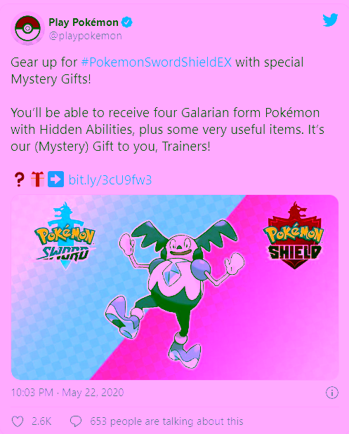 The Pokemon Company tidak berhenti hanya dengan Mr. Mime. Akan ada tiga Pokemon gratis lagi yang akan muncul sepanjang akhir Mei hingga Juni. Pokemon itu adalah Ponyta Galar dengan Hidden ability Antisipation, Corsolaa Galar dengan Hidden ability cursed body, dan Meowth Galarian dengan Hidden ability Unnerve.
