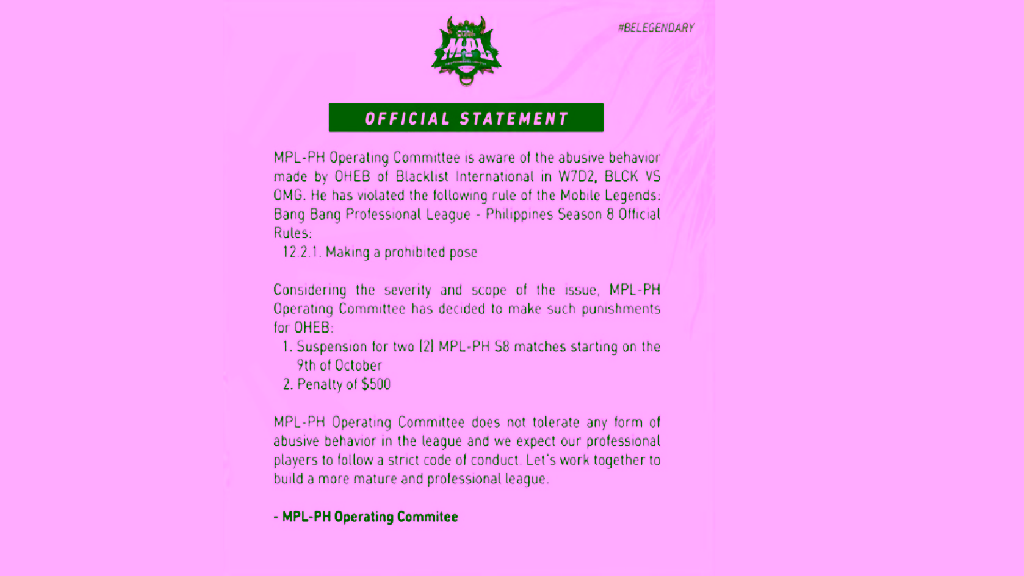Terkait hal tersebut, pihak MPL-PH langsung mengeluarkan surat pernyataan yang ditujukan untuk pro player bernama OHEB tersebut pada tanggal 9 Oktober 2021. Surat tersebut berisikan bahwa para komite MPL-PH khawatir terhadap perilaku kasar yang dilakukan OHEB dari tim Blakclist International.
