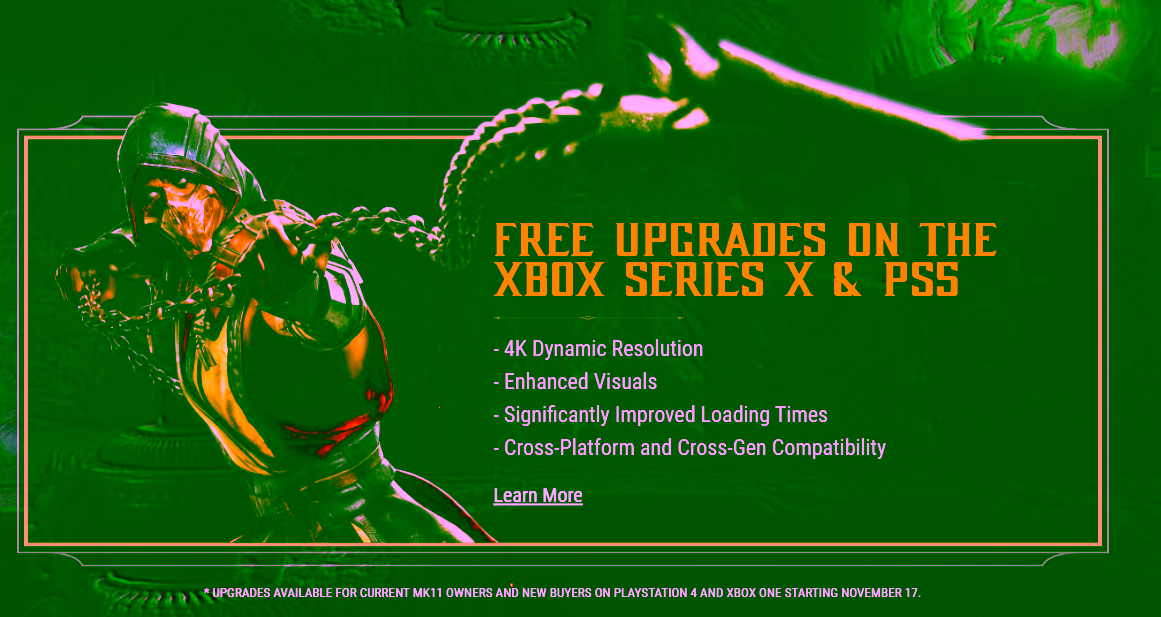 Tidak hanya update DLC karakter saja, Melalui situs resmi Mortal Kombat 11 mereka konfirmasi akan mendapatkan “Free Upgrade” bagi para gamer yang ingin memainkan Mortal Kombat 11 di Next Gen Console pada Playstation 5 maupun pada Xbox Series X, dan pastinya akan ada beberapa improvement pada game tersebut bila kalian memainkannya di Next Gen Console seperti, 4K Dynamic Resolution, Enhanced Visuals, Improved Loading Times, beserta Cross Platform dan Cross Gen Compability.