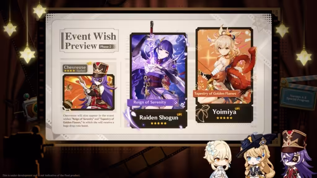 Lanjut ke phase dua, yang mana akan hadirkan rerun Raiden Shogun sang Electro Archon dan juga rerun Yoimiya. Di phase ini, banner mereka akan diramaikan oleh kehadiran karakter Fontang *4 baru, Chevreuse! Nah, kan. Makin bingung mau bawa pulang siapa :3
