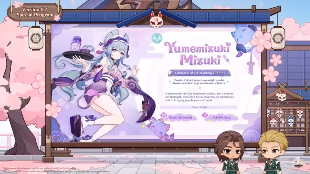 Secara lore, Mizuki adalah seorang psikolog dan pemegang saham utama Aisa Bathhouse di kota Inazuma. Dia merupakan youkai “yumekui-baku” yang bisa menyedot mimpi buruk. Kemampuan inilah yang membuat tempat pemandiannya jadi ramai dan reputasinya melejit. Tapi, tak banyak orang tahu bahwa Mizuki akan kelelahan setelah menghisap mimpi buruk dan tak menutup fakta dia bisa pingsan.