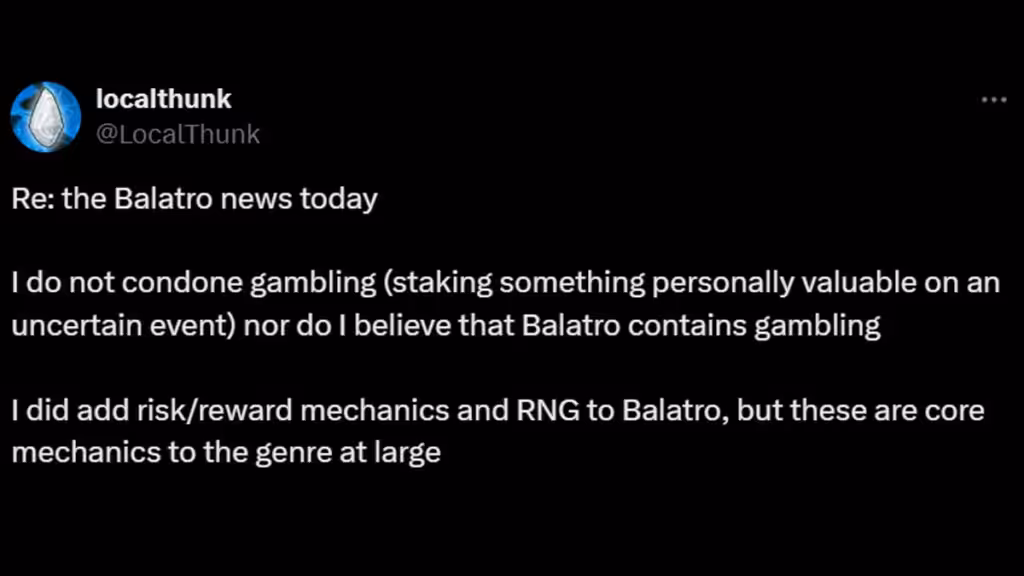 “Balatro tidak mengizinkan ataupun mendorong perjudian. Dan kami pada dasarnya percaya bahwa keputusan rating ini tidak berdasar”, lanjut PlayStack. “Balatro dikembangkan oleh seseorang yang anti perjudian, dan secara seksama memastikan bahwa game tidak menghadirkan mekanik perjudian dalam bentuk apapun”.