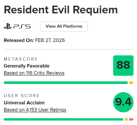 Saat artikel ini ditulis, Resident Evil Requiem berhasil mencetak skor yang terbilang tinggi di Metacritic. Game ini bahkan berhasil melampaui posisi tertinggi yang sebelumnya dipegang oleh Resident Evil 4 terbitan 2005.