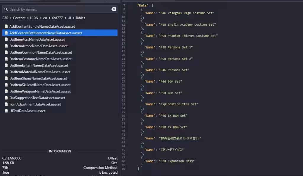 Berdasarkan penemuan yang dia dapatkan, ditemukan ada 6 DLC yang akan datang, yaitu Exploration Item Set, P4G EX BGM Set, P5R EX BGM Set, Velvet Room Costume Set, Velvet Room BGM Set, dan juga Episode Aigis / The Answer beserta BGM Set-nya. Semua DLC tersebut tertulis di bawah nama “P3R Expansion Pass”.