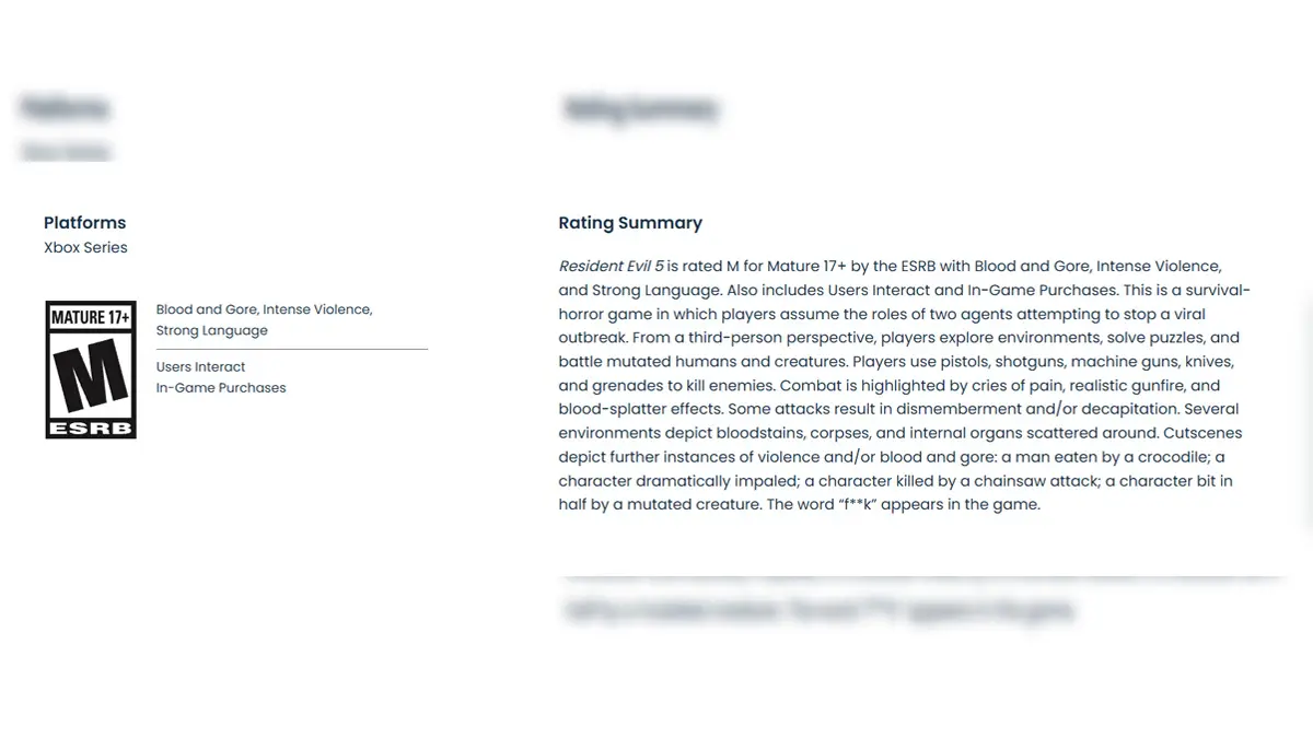Melalui halaman resmi ESRB, Resident Evil 5 mengalami perubahan dalam deskripsi singkat game, khususnya di platform Xbox Series. Lewat pembaruan, kata “In-Game Purchases” menjadi fokus utama di sini.