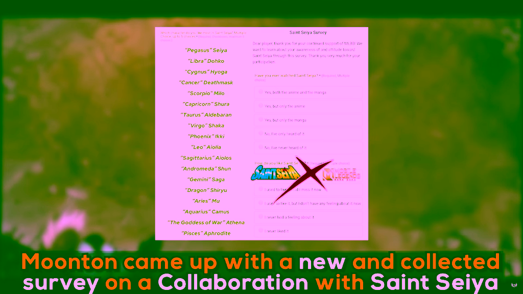 Moonton selalu melakukan survey terlebih dahulu sebelum melakukan kolaborasi agar dapat melihat antusias para pemainnya. Berdasarkan survey tersebut, ada 13 nama karakter yang kemungkinan besar dijadikan skin. Dan serial Saint Seiya sendiri identik dengan zodiac sehingga kemungkinan besar jika skin ini mungkin saja menjadi salah satu skin zodiac yang benar – benar limited.