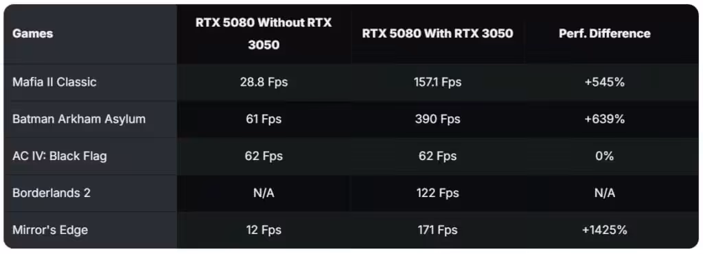 Beruntung, seorang gamer bernama Jerubedo di Reddit mengklaim mampu mengatasi masalah PhysX tersebut hanya dengan mengombinasikan RTX 5090 miliknya dengan RTX 3050. Cara unik ini ternyata berhasil mendongkrak FPS ketika ia memainkan game jadul seperti Mafia II Classic, Batman Arkham Asylum, dan Mirror’s Edge sampai belasan kali lipat.