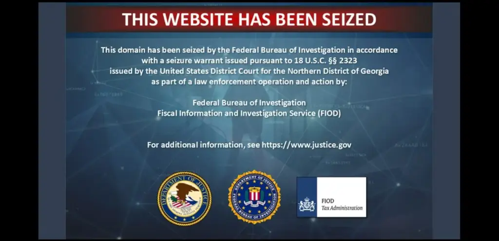 Domain ini telah disita oleh FBI sesuai dengan surat perintah penyitaan yang dikeluarkan berdasarkan 18 USC 2323 oleh Pengadilan Distrik Amerika Serikat untuk Distrik Utara Georgia sebagai bagian dari operasi dan tindakan penegakan hukum oleh FBI dan Layanan Informasi dan Investigasi Fiskal.”