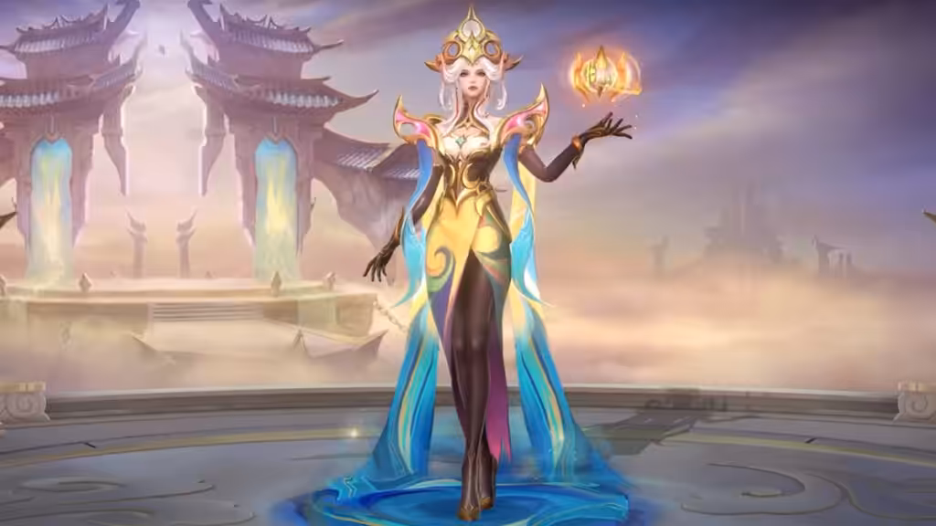 Valentina yang dijuluki Dewi Kegelapan, seketika berubah menjadi Dewi Kahyangan saat skin ini dirilis. Berbalut jubah elegan dan anggun, Valentina tampak cantik dengan gradasi outfit biru-kuning-putih hingga ke selendangnya.