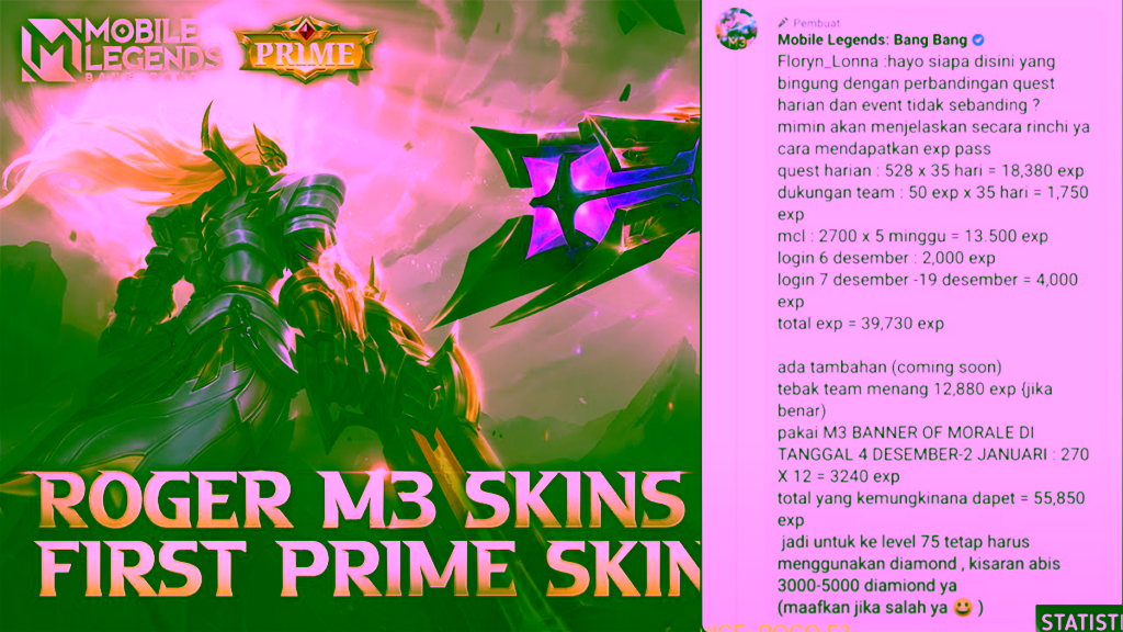 Detail hitungan pendapatan EXP M3 Pass untuk dapatkan skin Roger Prime sebagai berikut.
