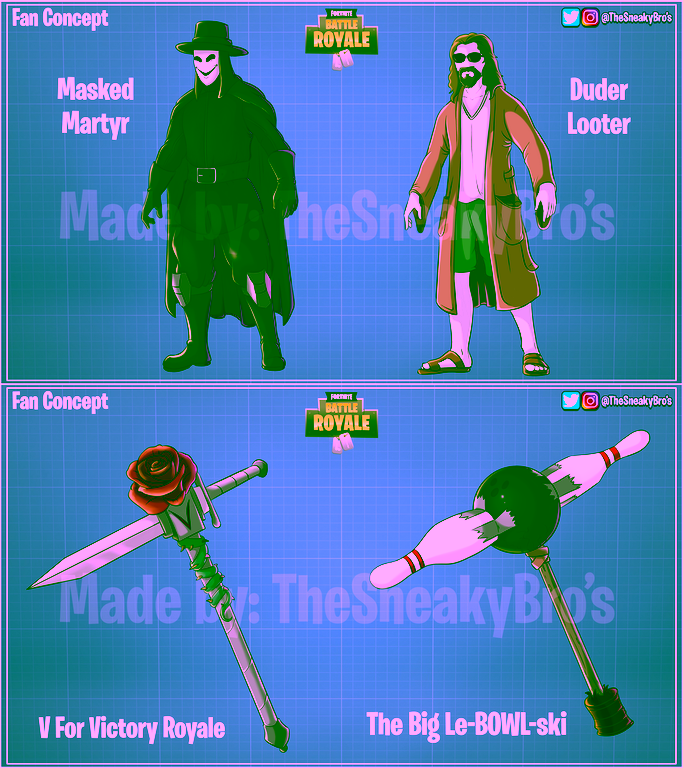 Setelah tadi seorang fan dari Fortnite membuat sebuah skin Black Panther, kali ini ada lagi seorang fans yang membuat sebuah desain Skin V for Vendetta dan The Big Lebowski yang terinspirasi dari karakter di film tersebut. Fans tersebut adalah duo designer yang menamakan diri mereka The Sneaky Bros.