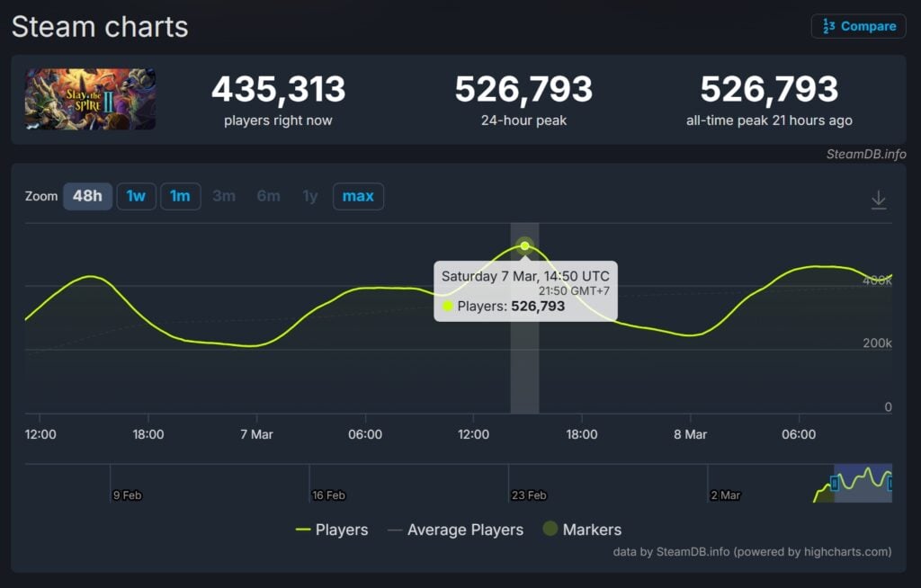 Lebih lanjut, tercatat ada sebanyak 435.313 orang yang tengah memainkan Slay the Spire 2 di Steam saat artikel ini diterbitkan.