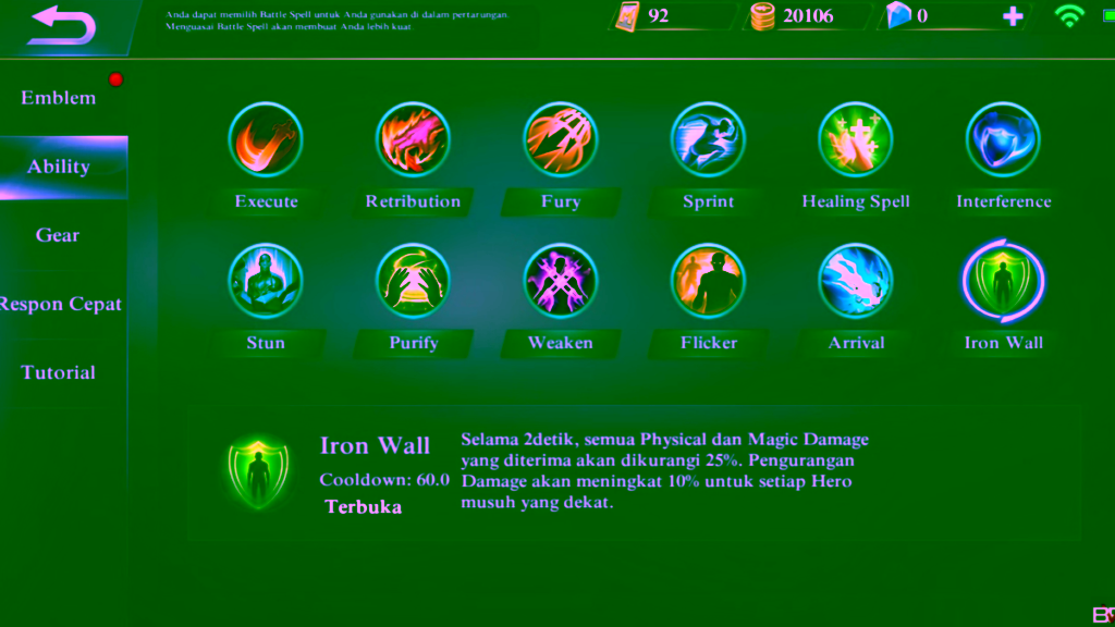 Spell Iron Wall miliki efek pengurangan Magic dan Physical damage yang diterima sebanyak 25% selama 2 detik. Pengurangan damage akan meningkat sebanyak 10% untuk setiap Hero musuh di sekitar kita.