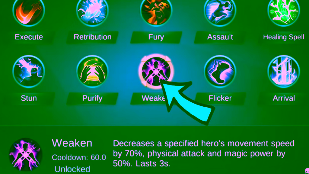 Spell Weaken memiliki efek yang sama dengan namanya di Mobile Legends. Spell ini akan melemahkan musuh dan berikan efek pengurangan Movement Speed sebesar 70%, serta mengurangi Physical dan Magical Attack musuh sebesar 50% selama 3 detik.
