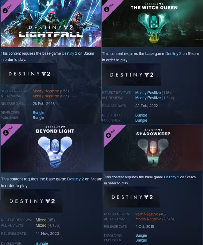 Game dari Bungie itu mendapatkan kritik negatif dan juga mixed nyaris di semua DLC yang ada di Steam Store terkecuali The Witch Queen yang dinilai sebagai ekspansi terbaik yang game tersebut pernah dapatkan.