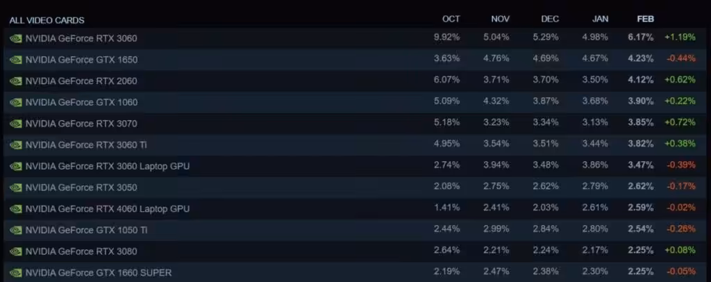 Bulan dua lalu tampaknya terjadi pergeseran minat terhadap perangkat maupun komponen yang digunakan oleh para gamer. Hasil Steam Hardware Survey Bulan Februari 2024 yang baru-baru ini mengemuka, terlihat menunjukkan VGA RTX 3060 yang kembali menjadi favorit para gamer. Loh, gimana nasib komponen lainnya, ya?