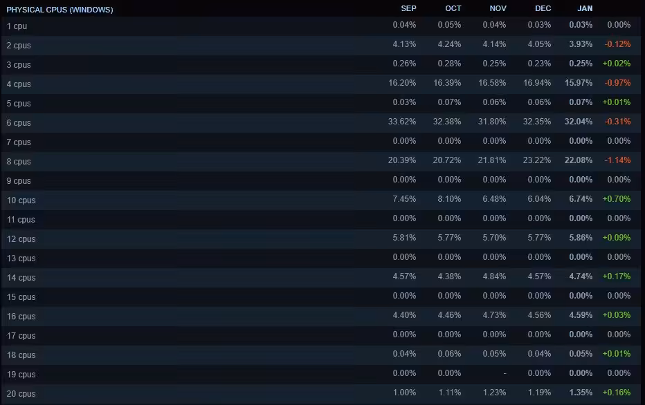 Berpedoman pada Steam Hardware Survey Januari 2025 ini, ternyata prosesor 6 core masih populer. Bagaimana tidak, berbekal skor akhir di 32.04% dan meski telah mengalami penurunan sekitar 0.31%, tetap saja indikasikan bahwa prosesor 6 core sukses tawarkan price to performance yang sesuai dengan kebutuhan.