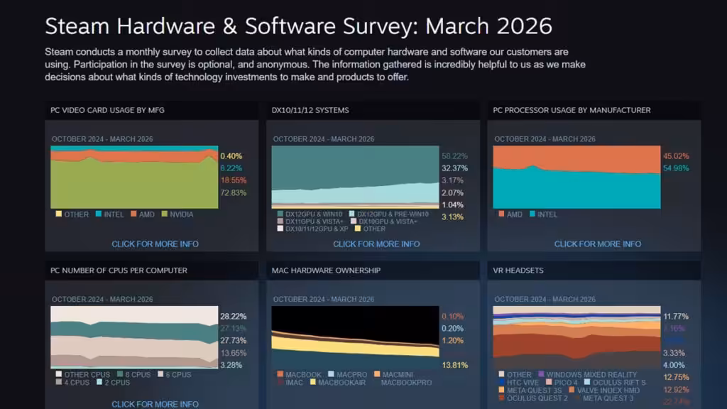 Melalui informasi yang terpampang di laman resminya, hal menarik kembali terjadi di bulan ini. Hasil Steam Hardware Survey Maret 2026 menunjukkan adanya pergeseran tren hardware yang cukup signifikan di kalangan gamer yang menggunakan platform milik Valve tersebut.