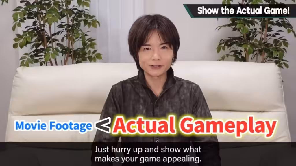Masahiro Sakurai mengatakan bahwa jika ingin menjual game, sangat penting bagi developer untuk memperlihatkan seperti apa aksi gameplay yang ada di game mereka buat.
