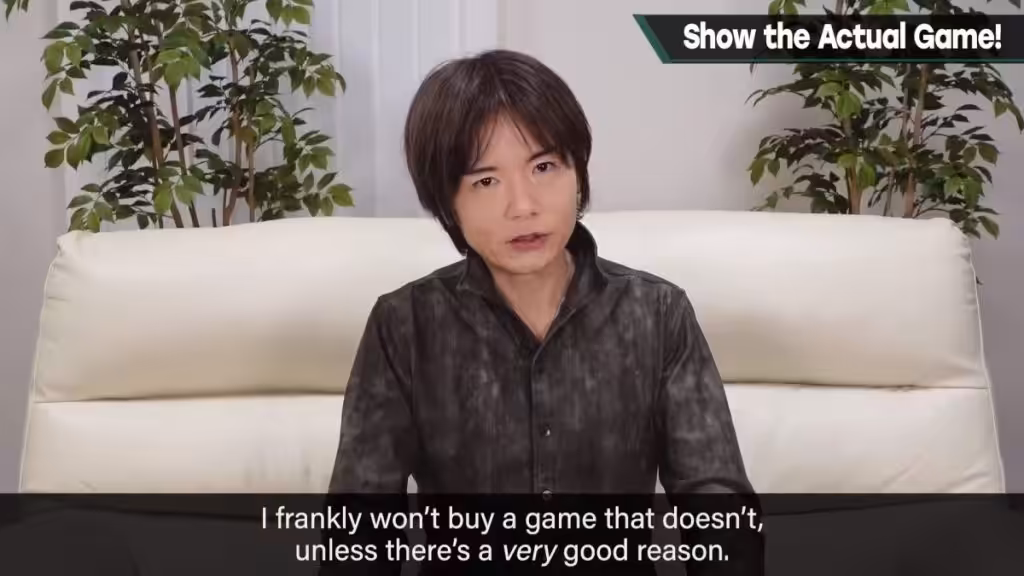 Melalui sebuah video terbaru di channel Youtube miliknya, Masahiro Sakurai memberikan tanggapannya terhadap trailer game yang sering ditemukan tidak menunjukkan gameplay yang ada di dalamnya. Hal ini cukup membuat banyak Gamer kurang suka dan geram karena mereka tidak dapat melihat seperti apa gameplay yang ada di game tersebut.
