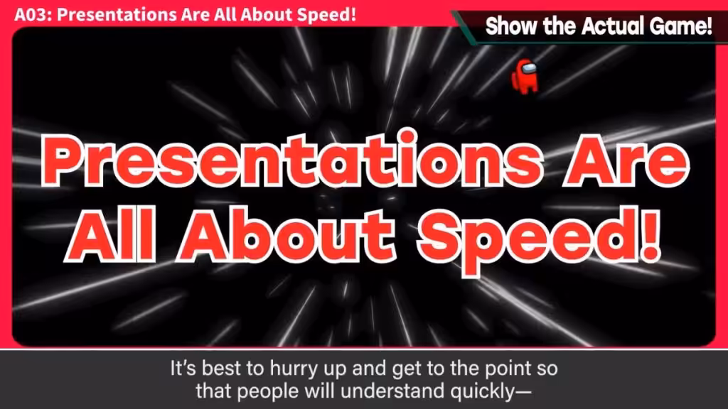 Jadi secara garis besar, Sakurai menyarankan developer game langsung to-do-point dalam video trailer mereka daripada harus bolak-balik tanpa memperlihat seperti apa game yang mereka buat dari segi gameplay. Dalam melakukan persentasi, kecepatan adalah hal penting untuk memperkenalkan game yang dibuat developer dan langsung ke inti dari trailer-nya.