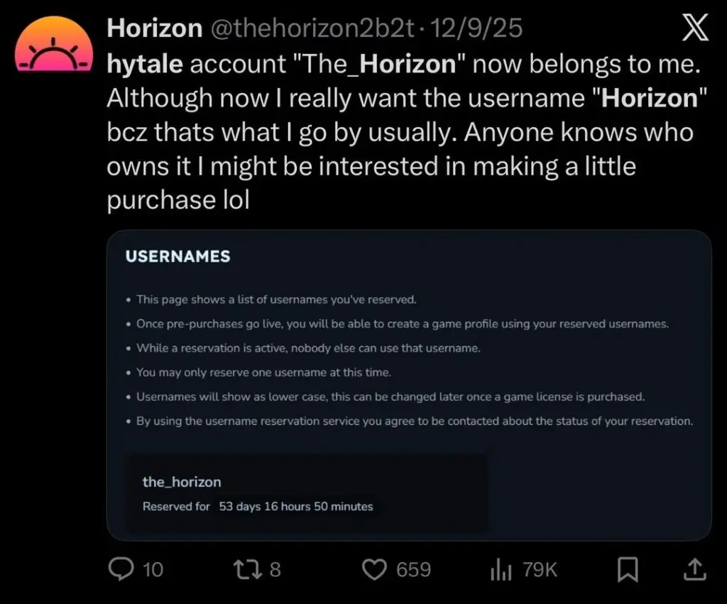 Ada juga YouTuber bernama MashClash yang mengaku mendapatkan username “Mash” setelah mengajukan permintaan ke tim Hytale. Lalu, dalam satu unggahan Reddit, ada pemain yang mengaku kehilangan username lamanya dan berubah menjadi nama general seperti “CoralShield434” yang jauh berbeda dari nama yang ia pilih saat register.