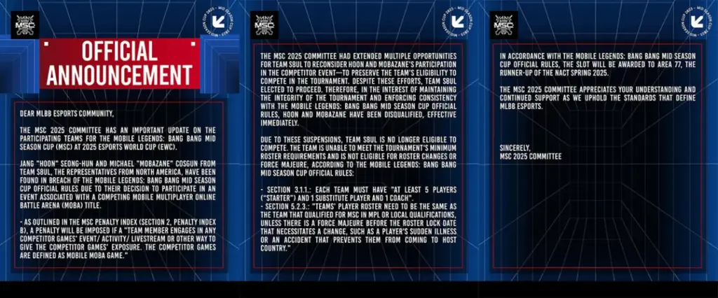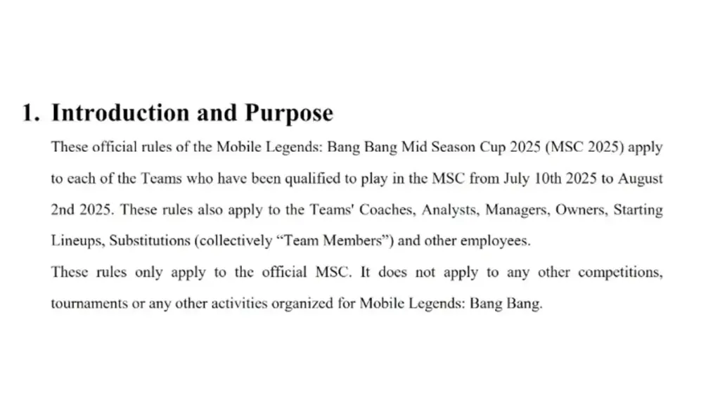 Peraturan yang dimaksud adalah peraturan resmi MSC 2025 dimana pemain tidak boleh berpatisipasi dalam acara yang berhubungan dengan game Mobile Multiplayer Online Battle Arena (MOBA) lain selain MLBB. Peraturan tersebut menurut MSC berada pada Section 2, Pinalty Index B dalam peraturan tertulis mereka.