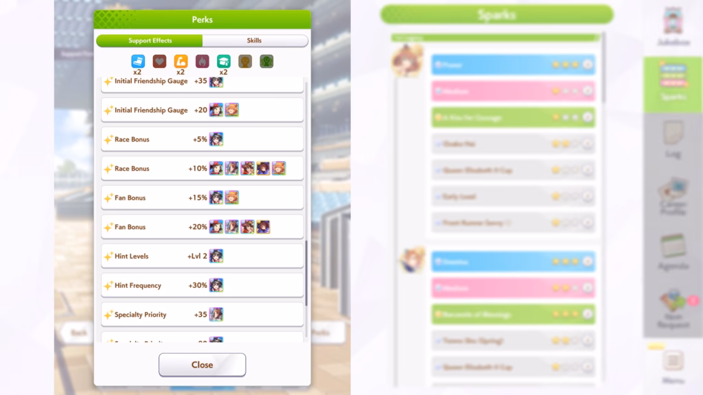 Oleh karena itu, menggunakan Support Card yang memberikan efek Race Bonus tentu sangat bagus karena setiap balapan kamu akan mendapatkan bonus stat dan skill point. Kami merekomendasikan total Race Bonus sedikitnya 50%. Namun, jika kamu bisa mendapatkan lebih dari itu, tentu akan lebih baik.