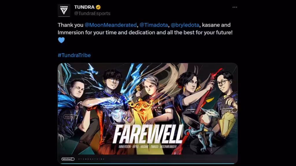 Baru-baru ini melalui akun Twitter Resmi tim, Tundra Esports mengumumkan bahwa mereka telah melepas 4 pemain serta pelatih dari divisi Dota 2 mereka. Pemain yang dilepas adalah Timado, Bryle, Kasane, dan Immersion. Tim ini juga melepas Coach mereka yaitu MoonMeander.