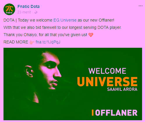 Dan hari ini, secara resmi Khoo “Ohaiyo” Chong Xin mengkonfirmasi bahwa dirinya tidak menjadi bagian dari tim Fnatic lagi melalui akun Facebooknya. Selang berapa jam kemudian, Fnatic secara resmi mengumumkan bahwa Saahil ‘UNiVeRsE’ Arora resmi bergabung menjadi salah satu bagian dari tim Fnatic mengisi posisi offalner.