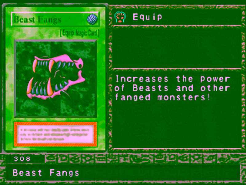 Beast Fangs di game ini tetap meningkatkan ATK monster tipe Beast, tapi juga meningkatkan ATK monster lain yang bertaring, seperti contohnya, Twin-Headed Thunder Dragon. Monster di dalam artwork kartu tersebut memiliki taring, sehingga menjadi target yang legal untuk Beast Fangs. Teks dari kartu tidak memberi tahu monster apa saja yang bisa bekerja dengan Beast Fangs, dan juga tidak memberi tahu jumlah ATK yang meningkat.
