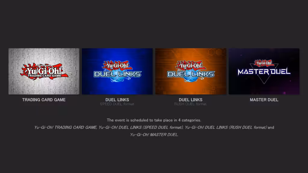 Menariknya lagi, Turnamen ini akan menghadirkan 4 kategori turnamen termasuk kategori untuk video gamenya. Pengumuman mengenai kategori video game seperti Master Duel dan juga Duel Links akan diumumkan pada masing-masing game.